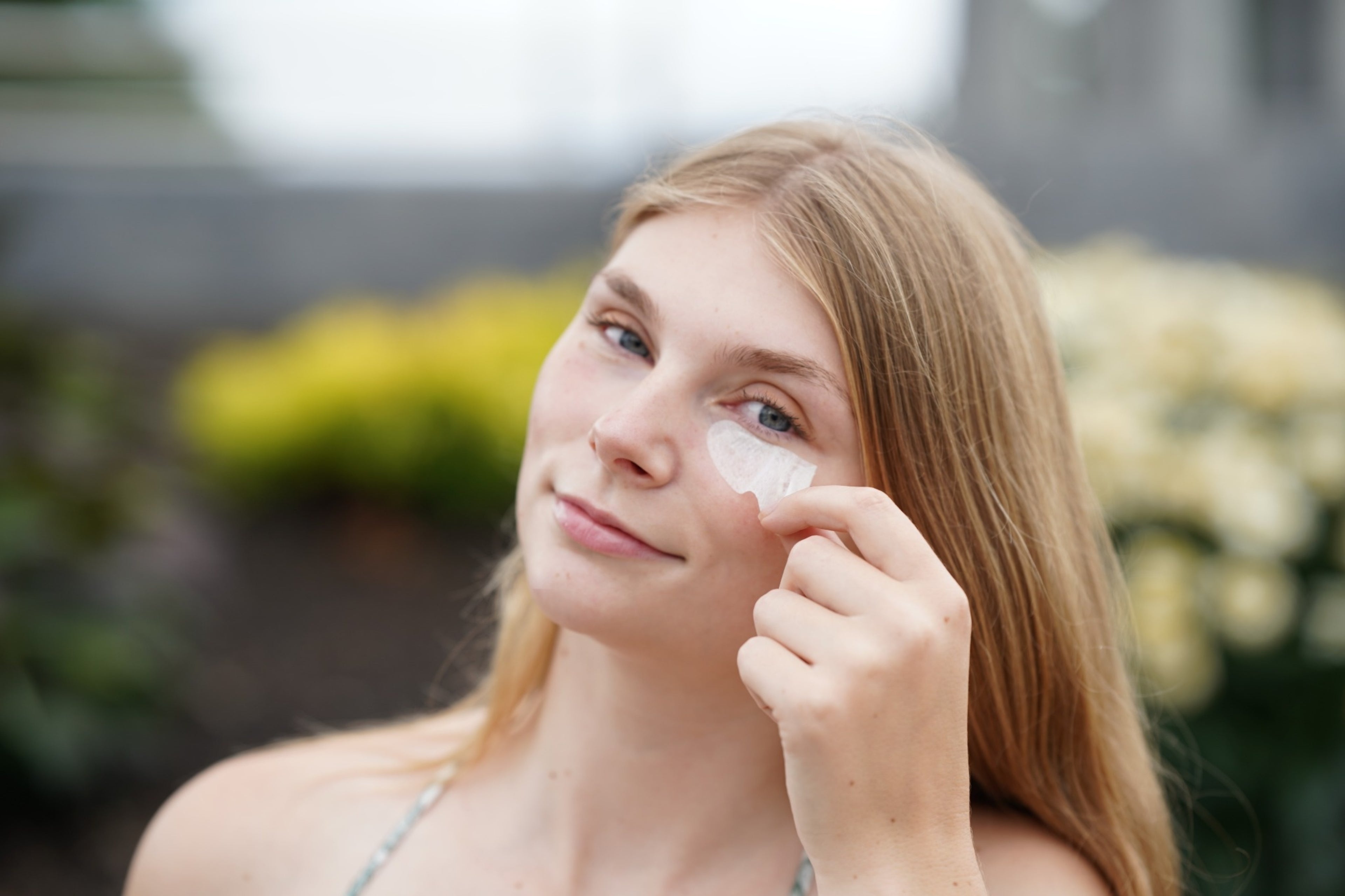 Apply the patch to your face, using the film side that was covered with the plastic.